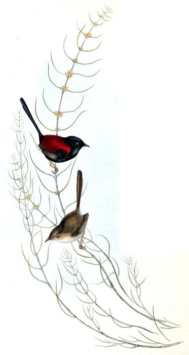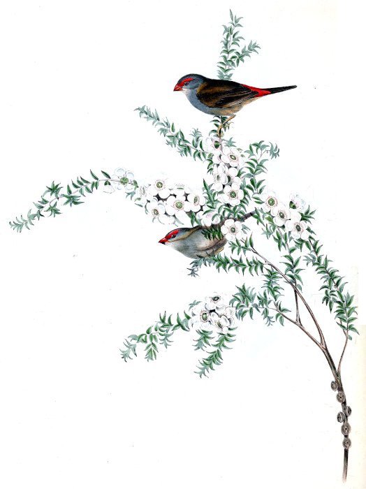 This species of Finch is very generally spread over the gardens and all such open pasture lands of New South Wales and South Australia as abound in grasses and small plants, upon the seeds of which it chiefly subsists. It is particularly abundant in the neighbourhood of Sydney; even in the Botanic Garden numbers may always be seen flitting from border to border. It is easily domesticated, and is of a lively disposition in captivity, even old birds becoming perfectly reconciled after a few days. In the autumn it is gregarious, and Mr. Caley states it often assembles in such large flocks, that he has killed above forty at a shot; in the spring they are mostly seen in pairs, and then build their large and conspicuous nest, which is formed of dead grass, lined with thistle down, in any low bush adapted for a site, but in none more frequently than in the beautiful plant figured in the accompanying Plate (Leptospermum squarrosum) which was made by Mrs. Gould during our stay in Sydney; and I feel assured it will be acknowledged, that in delineations of flowers as well as of birds her pencil was directed by a hand at once masterly and truthful.