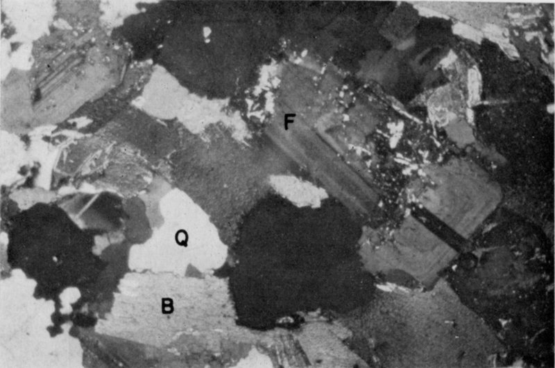 Figure 2. Thin-section of granite from Burke Mountain. The main minerals seen in this photograph are feldspar (light gray center right, marked with “F”); quartz (whitish, marked with “Q”); biotite (light gray, speckled appearance, marked with “B”). Note the interlocking nature of the minerals which make up this rock. Magnified 15 times, under crossed nicols.