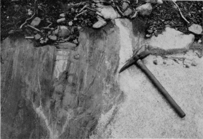 Figure 10. Banded or layered metamorphic rocks with inter-squeezed granite (lighter colored material). This outcrop is located on east side of the Bear Den Ski Trail and quite close to the Burke Mountain summit road. The hammer handle, center of picture, is about one foot long.