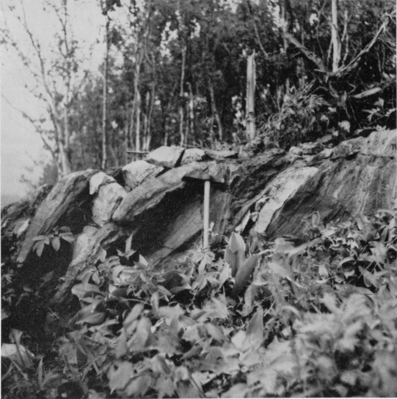 Figure 16. Midway between the second and third turns, descending on the Burke Mountain summit road. Metamorphic quartzite and phyllite showing at least two prominent joints. Layers are vertical and parallel to the front joint (one which hammer handle touches). For the more advanced student of geology, note the lineations parallel to the hammer handle and on the front surface. For scale, hammer handle is about one foot long.
