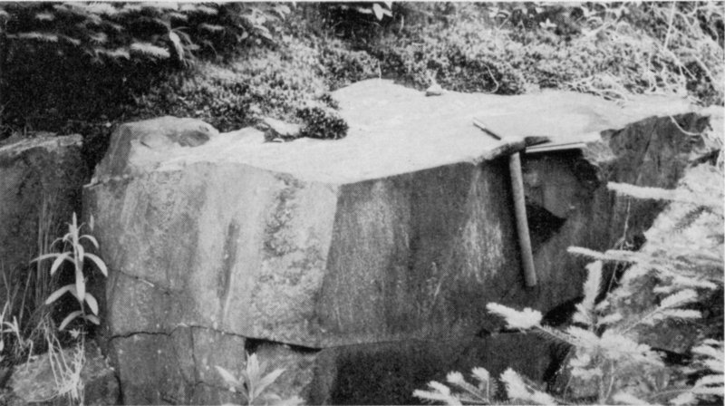 Figure 15. Glacial striations or scratches on outcrop midway between the second and third turns in the road down from the summit area of Burke Mountain. Striations trend about 40 degrees east of south or in approximately the same direction that the hammer handle is pointing. Hammer handle is about one foot long.