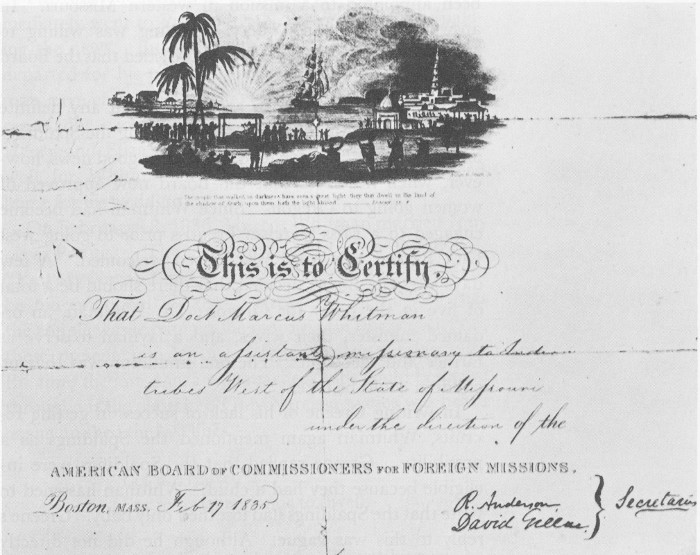 Marcus Whitman’s certificate appointed him “an assistant missionary to Indian tribes West of the State of Missouri.” It was also necessary for the missionaries to get permission from the Secretary of War to visit the Indian lands of western United States.