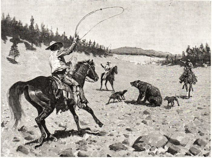 I have seen many illustrations of the inefficacy of lighter charges of powder, and known several instances where, had men using them been alone, they would have fared very badly from the wrath of the grizzly. My own experience has taught me that the heavy charge is desirable. I certainly should not go after a grizzly with anything less than a .45-90. That is why I have always advocated plenty of powder back of the ball when you come to tackle "Old Ephraim." Lately a cartridge has been put on the market, a .30-40, of smokeless powder, which is said to be very killing. Theodore Roosevelt has used it on antelope, and tells me that it does splendid execution—certainly as good as, if not better than, any of the heavier charges. Archie Rogers, who is a noted bear-hunter, also used the gun out West last season, and killed a bear with it. These are two of the most experienced sportsmen in the country; but a gun in the hands of Archie Rogers after grizzly is a very different matter from its being in the hands of the ordinary sportsman, to say nothing of a tyro. The next time I go after bear I shall take along one of these guns and try it, but it seems to me it has not yet had sufficient trial against the grizzly to warrant its being advised for inexperienced hunters or for boys. The boy who reads this article and starts for grizzly, and values my advice, will provide himself with the old reliable .45-110-340. For black bear the .45-90 is sufficiently powerful, and many rifles of smaller calibre have been used on this member of the bruin family.