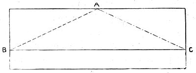 I shall now show you how to mark and cut this top piece into the shape here sketched. Cut the board first of all into an oblong, and mind that you mark it by your square, so that the ends shall be square to the sides. Let it be 2½ inches wide. Here it is (Fig. 10). Measure a length of 6 inches from either end to the middle at A, and make a mark at that place. Draw a line, C B, one inch from the opposite side, the whole length of the board, and mind you draw it correctly. You should measure an inch at B, and at C, and then draw a line from one point to the other along the edge of your rule. You must[19] now draw two lines from the spot you marked at A to the ends of this line (where you see the dotted lines). In order to cut this piece, you must begin at A, not at B or C, or else if the saw should stick you will be sure to split off a strip right across the piece; but if it should stick when you are cutting from A, you will only split off a bit of one of the three-cornered outside pieces, which would not signify at all.