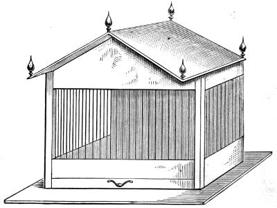 I shall suppose you now in possession of a carpenter’s rule, and that you have carefully learned all I told you of the inches and eighths, so that you may be able to measure[17] and mark your work very truly. The front of the cage is represented in Fig. 9, before the projecting roof-boards have been put on.
