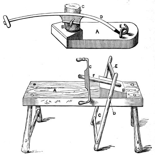 No. 4 is a drill-stock similar to the last, but in place of[331] the breast-plate a revolving head or handle is put to the top, in which the point works. This is held in one hand, while the drill-bow is worked by the other. This is also generally held against the chest, as the hand alone does not give sufficient pressure. Heavy work, however, cannot well be done by these breast-drills, and they are liable to cause spitting of blood from the constant pressure in the region of the heart and lungs.