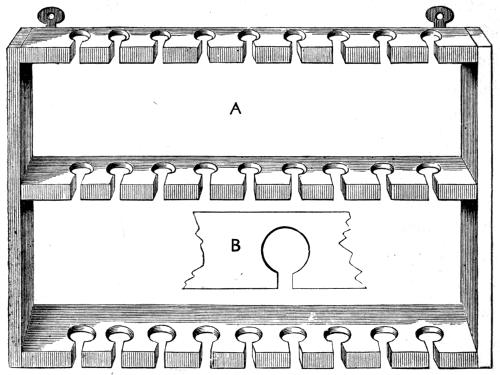 There is another way of going to work, namely, to put the whole framework of the cage together and add the wires afterwards. In this case (the holes having all been made beforehand as directed here) the wires are in turn inserted at the top, and then being slightly bent are put in place in the bottom piece—each wire being completely[23] fixed before the next is added. Either way may be tried, but in that given above the wires are not bent at all, and therefore have not to be straightened. Adding them, however, afterwards is the common practice among the cage-makers. Indeed, it generally happens in large establishments that one set of workmen make the woodwork, and another set add the wires—such division of labour proving more advantageous.