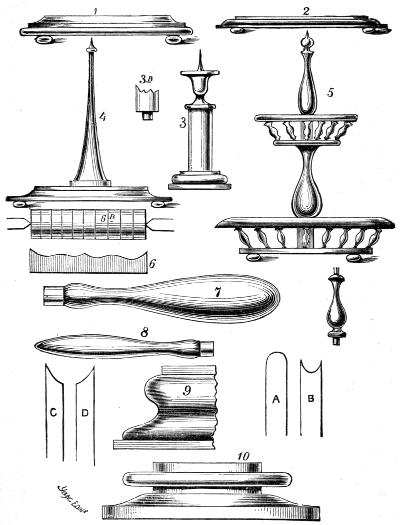 The next five chapters relate to the lathe, and the art of turning. The author follows the same plan as in the first part of the book, and gives more practical information in these few pages than we have seen in any other book on the subject, most of them being written apparently for finished mechanics, and not for beginners. The Art of Turning as an amusement, is beginning to attract considerable attention in this country, but not so much[ii] as it deserves and would obtain, if it were more generally known how many beautiful and useful articles can be produced in the lathe. The expense of the necessary tools has deterred many from attempting to learn this branch of mechanics; but we believe if any one has the time and patience to devote to the work, they will never have occasion to regret the money spent for this purpose.