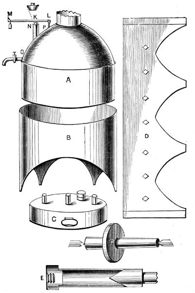 Fig. 67, B, is a half-section of such a boiler as I have just described. Fig. 68, A, is the lower part, which is separate, and forms the furnace in which the boiler stands, fitting it closely. This is drawn to scale, and is half the real size. a is the steam-pipe, fitted high up in the dome, the tap, b, serving to turn on or off the supply of steam for the cylinder; c is the safety-valve shown in section, and care must be always taken to make the conical part short and of a large angle, or it may stick fast, and cause an explosion; d is the glass gauge, to show the exact height of the water in the boiler. Its construction will be understood[309] from the other which is attached, where the boiler is seen in section. There is no need to have two, and this is added solely to explain the nature of glass-gauges. The top and bottom are of brass, being tubes screwing into the boiler, or fastened by a nut inside; a tube, g, of thick glass, connects these two, so as to form a continuous tube, one end of which opens into that part of the boiler which is full of steam, the other opening below the water-level. Thus the tube forms practically part of the boiler, and the level of the water is clearly seen. The lower tap is used for blowing off water, to insure the communication being kept open, as it might get stopped up with sediment.