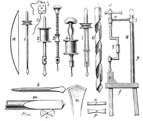 No. 2 is a larger drill, even now much used. In principle it is exactly similar to the last, but the pulley is replaced by a bobbin or reel of wood, made to revolve by a steel bow with a gut string, or a strong wooden bow. The drills, too, are separate, and fit into a socket at the bottom of the drill-stock. The large end is pointed, as in the last, and is made to rest in one of the holes in a steel breast-plate, b, which is tied to the chest of the operator, who, by leaning against it, keeps the drill to its work, while both hands are free to hold the latter steady. There is a modification of this tool, invented by a Mr Freeman, intended to do away with the bow. The bobbin or reel is turned without raised ends, and is worked by a flat strip of wood covered with india-rubber, and turned at one end to form a convenient handle. The having to twist the bow-string round the drill, which is always a bother, is thus done away with.