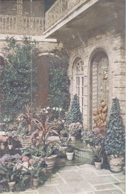 And here has been established a home, superbly built of rich old brick and traditional Southern iron grillwork. It is a perfect jewel in a perfect setting into which age-old romance and history have been woven. The lines of sturdy Norman grouping are softened and accented by the rich-railed balconies and porticos that bring to mind the quaint courts and cloisters of Southern Europe and the influence of Old France and Spain upon the Gulf Coast colonies.