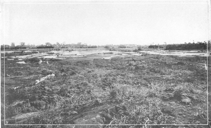 Panoramic view of Trinidad Asphalt Lake. The lake occupies a bowl-like depression, in area about 114 acres. It is bordered by low hills. The surface is dotted with clumps of trees and bushes, and broken by irregular pools of surface water. In the background to the left is part of the asphalt refinery, which extends from the hilltop to the edge of the lake