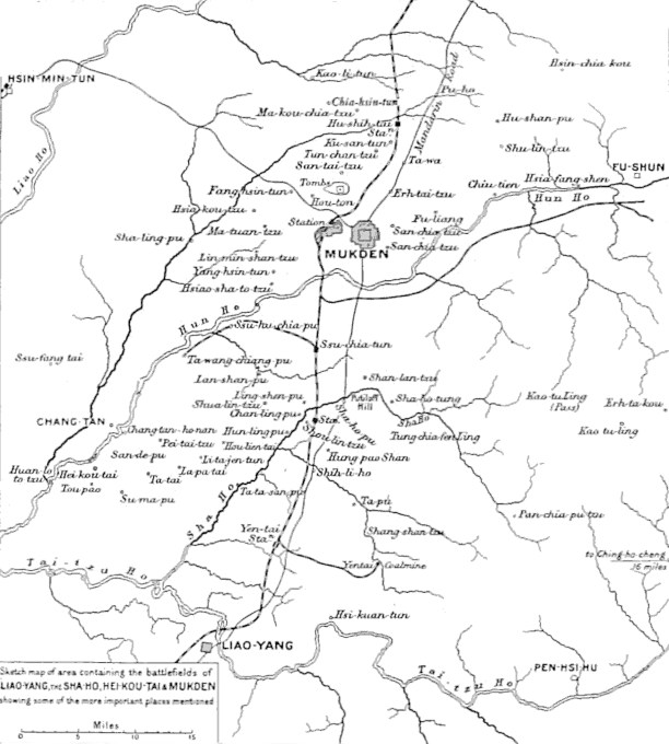 | SKETCH-MAP OF AREA CONTAINING THE BATTLE-FIELDS OF LIAO-YANG, THE SHA HO, HEI-KOU-TAI, AND MUKDEN, SHOWING SOME OF THE MORE IMPORTANT PLACES MENTIONED | At the end |