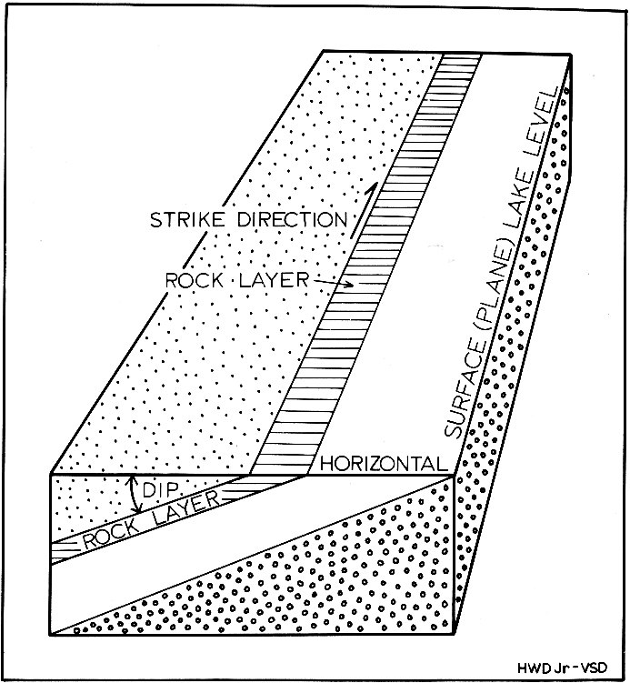 The park beach is the ideal place to study the rocks of the park, for here the rocks are best exposed and can be easily examined at close range. The attitude of the rock layers can be seen on a walk down the ramp. By attitude is meant their relationship to an imaginary horizontal plane, which for our purposes is the level of the lake. Are the rock layers parallel to the surface of Lake Champlain or do they slant or dip into it? If the layers were parallel to the surface they would not “dip.” The dip of the park strata (layers) is seen in Figure 2. Dip is expressed in the number of degrees down from the horizontal and here the dip is toward the west and is measured to be between 8 and 11 degrees. The dip is always measured perpendicular to an imaginary horizontal line on a rock layer called a “strike line.” The average “strike,” or compass direction of the “strike line” is 22 degrees east of north.[1]