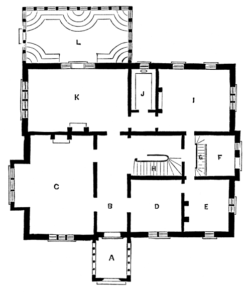 A, The Porch, pierced on each side with open lights. B, the Hall, in the form of an L, and receiving light from the roof. C, the Drawing Room, with its capacious bay window. D, a Parlor. E, Library and Study. F, Side Hall, with door, under stairs, communicating with passage leading to study; (or, there may be a door opening directly into the study from the side hall.) G, Private Stairs. H, Principal Stairs, under which is a door communicating with the passage to study. I, the Kitchen. J, Pantry. K, the Dining Room, with glass door leading out into the Conservatory L.