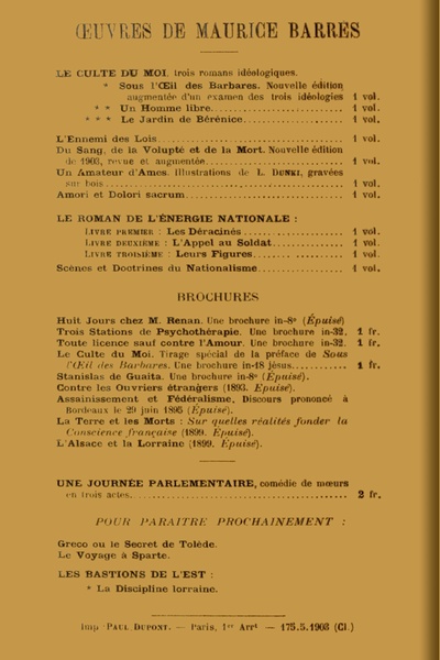 | Le Culte du Moi. Tirage spécial de la préface de Sous l’Œil des Barbares. Une brochure in-18 jésus | 1 fr. | |