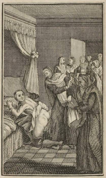 Angelique. Eh bien, tout doucement, qu'as-tu à t'allarmer? le grand mal de t'avoir trouvée en changeant de chemise, ou faisant autre chose de mieux; les bonnes amies ne se doivent aucunement cacher les unes aux autres. Assis-toi sur ta couche comme tu étois, je vais fermer la porte sur nous.