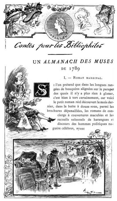 Le temps était gris et froid, des nuées montaient dans le ciel triste, et les aigres souffles d'une bise de novembre mêlée de gouttes de pluie fouettaient le visage des passants et les couvercles des boîtes à livres. Fallait-il pour douze sous laisser grelotter les innocents Amours de cet Almanach des Muses, dernière fleur éclose jadis au bord du précipice? Pouvait-on les laisser sous l'ondée menaçante fondre et périr définitivement peut-être? L'achat sentimental du pauvre petit bouquin fut donc une bonne action, une espèce de sauvetage, et vraiment le sauveteur n'eut pas à le regretter, malgré les apparences, quand il examina l'objet au coin de la cheminée.