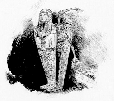 Revêtu de sa blouse d'anatomiste, armé de son scalpel, le docteur F…, bien connu de tous les archéologues égyptiens, procéda au dépouillement de la momie, qui avait été étendue sur une planche reposant sur deux chevalets. Il trancha les premières bandelettes et déligota lentement la pièce rigide et noirâtre, tandis que le conservateur adjoint du musée fournissait aux assistants les renseignements précis sur l'examen sommaire des documents écrits, découverts dans le tombeau, et dont l'importance, paraît-il, était exceptionnelle.