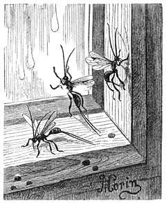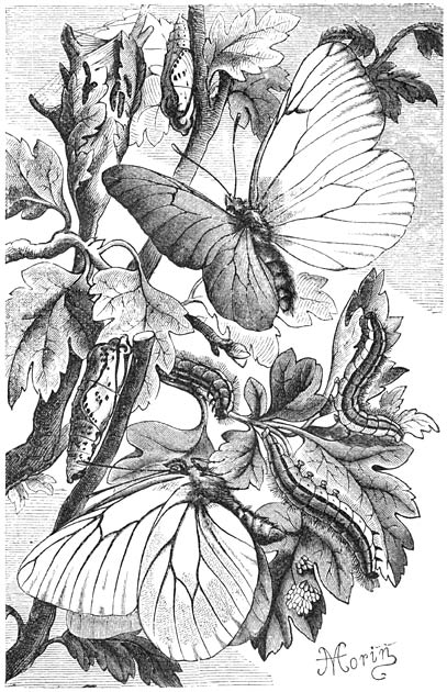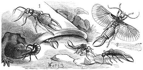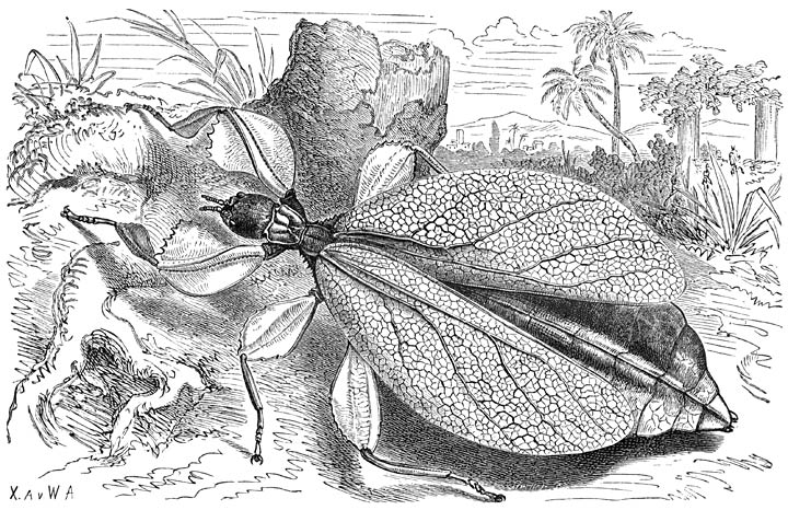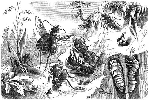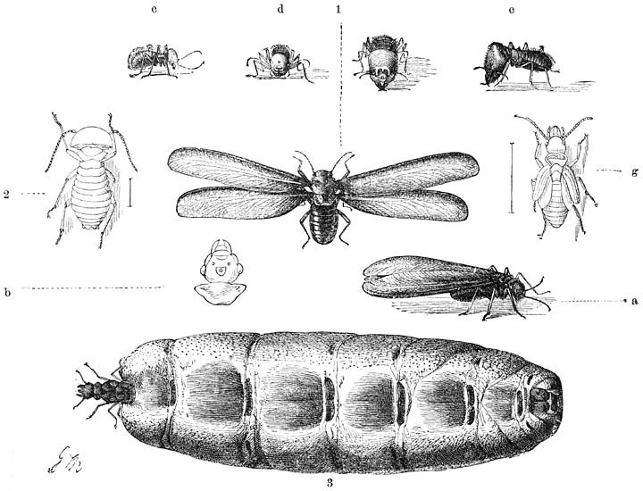 Dikwijls is het voor een ongeoefend oog moeilijk om aan uitwendig waarneembare kenmerken de mannetjes en de wijfjes van een en dezelfde soort te onderscheiden, daar zij bijna volkomen overeenstemmen. Toch zijn er ook vele Insecten, waar het verschil tusschen de dieren van beiderlei sekse zoo sterk in ’t oog valt, dat men zich er volstrekt niet over behoeft te verwonderen, dat sommige onderzoekers het mannetje [360]onder dezen, het wijfje onder een anderen naam beschreven en als leden van verschillende soorten aangemerkt hebben. Zoo hebben b.v. bij eenige orden van Insecten de mannetjes vleugels, terwijl de wijfjes ongevleugeld zijn en is het lichaam van deze op geheel andere wijze gebouwd of gekleurd dan dat van gene.