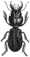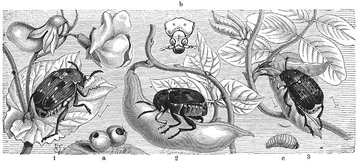 1) Tuin-loopkever (Carabus hortensia), 2) Poppenroover (Calosoma sycophanta), 3) Goudgroene Loopkever (Carabus auratus) met larve. Ware grootte.