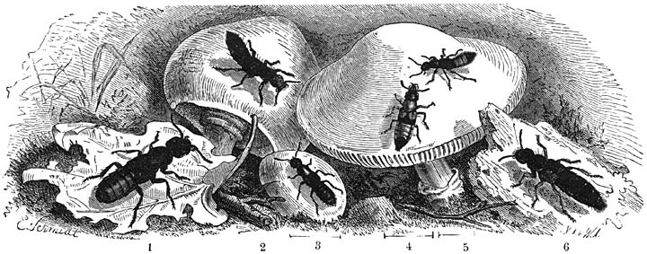 Om den liefhebber van de natuur een goede voorstelling van de familie der Carabiden te geven is geen harer geslachten beter geschikt dan dat der Loopkevers i.e.z. (Carabus) of een zijner naaste verwanten. Door hun aanzienlijke grootte, hunne metaalachtige kleuren en hun lichaamsvorm, waarin de eigenaardigheden der familie goed uitkomen, trekken deze Kevers ook reeds in de vrije natuur, te midden van de talrijke andere middelmatig groote of kleine [366]soorten, maar beter nog in een goed gerangschikte verzameling onmiddellijk de aandacht, zelfs van den leek op dit gebied. Gemiddeld is hun lengte 22 mM.; vele soorten zijn grooter; terwijl van slechts weinige de lengte niet meer dan 15 mM. bedraagt. De kop is naar voren gericht en aanmerkelijk smaller dan het halsschild; de bovenlip splitst zich in 2 lobben; de inkerving aan de kin draagt een krachtigen middeltand; het eindlid van den taster is bijlvormig. Het halsschild is scherp gescheiden van de dekschilden, die een eivormig geheel uitmaken en in kleur met het halsschild en den kop overeenstemmen, hoogstens aan den buitenrand een levendiger kleur vertoonen, maar wat de sculptuur van de oppervlakte betreft, zeer verschillend kunnen zijn. Behoudens enkele soorten, welker leden bij uitzondering in ’t bezit zijn van goed ontwikkelde vleugels, zijn deze steeds rudimentair of afwezig, zoodat alle Carabus-soorten alleen als flinke voetgangers in hun onderhoud kunnen voorzien. Goudgroen, blauw en bronsbruin zijn de metaalkleuren, die, nevens zwart, bij de Caraben voorkomen en verschillende nuances vertoonen in verband met de tot woonplaats dienende streek.