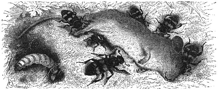 Eigenaardig zijn de Zandkever-larven; vooral het blaasvormig gezwollen onderste deel van het aangezicht en de beide naar voren gerichte doornen op den rug van den 8en ring na den kop vallen onmiddellijk in ’t oog. De hoornachtige kop draagt aan iedere zijde 4 oogen (2 groote aan de boven-, twee kleinere aan de onderzijde), 4-ledige sprieten en monddeelen, welke op die van het geslachtsrijpe dier gelijken. De larve graaft een verticale soms wel 47 cM. diepe buis, ter dikte van een penneschacht, in den grond en loert aan den ingang op Insecten, kleine Loopkevers, Mieren en larven. Als zij een dier gegrepen heeft, daalt zij er mede af naar den bodem van haar hol, bijt het stuk en zuigt het sap op. De overblijfselen worden naar buiten vervoerd; de uitgeholde bovenzijde van den kop is voor ’t dragen, het gedoornd zijn van den 8en ring voor ’t opstijgen en neerdalen in de buis van groot belang. Na eenigen tijd verwijdt zij den bodem van haar hol, maakt den ingang dicht en verandert in een pop, die de aandacht trekt door de doornachtige uitgroeisels aan weerszijden van den rug; deze zijn op het vijfde lid van het achterlijf bijzonder sterk ontwikkeld en doen waarschijnlijk dienst bij het te voorschijn komen van den Kever uit den grond. De duur van den poptoestand bedraagt, naar het schijnt, slechts 14 dagen.
