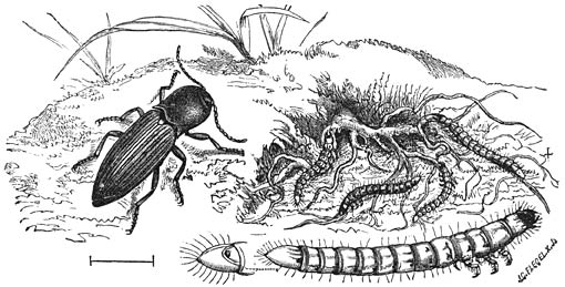 Onze bekendheid met de larven van de Kevers is nog altijd zeer onvolledig. Haar uitwendig voorkomen vertoont op verre na niet de groote verscheidenheid, die men bij de geslachtsrijpe dieren opmerkt. Daar de meeste een verborgen leven leiden en dus niet aan den invloed van ’t licht zijn blootgesteld, komen bij haar geen bonte kleuren voor en heeft vuilwit of geelachtig wit de overhand. De stam van haar lichaam bestaat uit een hoornachtigen kop met 12 (of 11) daarop volgende leden; deze zijn pootloos, tenzij de 3 borstringen ieder één paar hoornachtige pooten dragen. De kop, die dikwijls een weinig teruggetrokken kan worden in het voorste rompsegment, heeft bij sommige een hellenden stand, zoodat de monddeelen dicht bij de borst komen te liggen, en is bij andere recht naar voren gericht; ook zijn vorm is verschillend. De oogen zijn steeds enkelvoudig en staan, voorzoover zij niet geheel ontbreken, ten getale van 1 à 6 aan weerszijden van den kop. Bij vele soorten komen tusschen de oogen en de bovenkaken draad- of kegelvormige sprieten voor. Deze bestaan in den regel uit 4, soms echter uit een geringer aantal leden, waarvan het derde niet zelden een zijwaarts gericht aanhangsel draagt. De monddeelen verschillen niet aanmerkelijk van die der volwassen Kevers, tenzij een [364]beweegbaar kopschild de mondopening van boven begrenst. Hoewel enkele deelen van de onderlip ontbreken kunnen, is dit paar monddeelen standvastiger aanwezig dan de onderkaken. De 12 leden van den romp zijn soms hard en glad, soms zacht en dwars gerimpeld; bij vele soorten komen zij onderling nagenoeg overeen; dikwijls echter onderscheiden de 3 voorste, die later het borststuk zullen vormen, zich op de een of andere wijze van de overige.