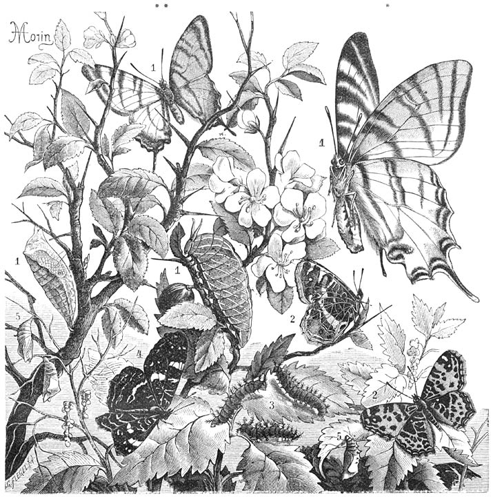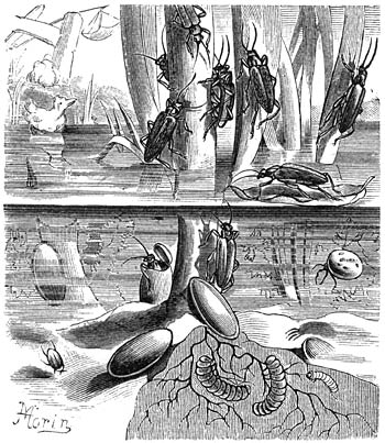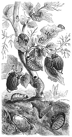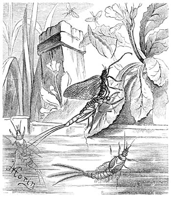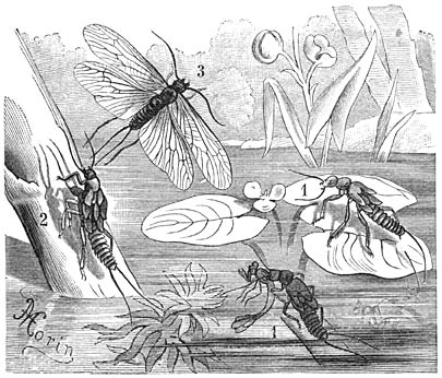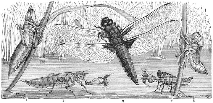 Zoolang het jonge dier door de eihuid omsloten is, heet het embryo of kiem. Op het oogenblik waarin het de eischaal verlaat, d. i. geboren wordt, houdt het op embryo te zijn en wordt een larve, daar het in de meeste gevallen volstrekt niet op het volkomen Insect gelijkt, maar als ’t ware een “masker” draagt, aan een Worm gelijk, op of in de aarde kruipt en den steeds nijpenden honger met bladen, dieren of rottende stoffen stilt, terwijl zijne ouders in een geheel andere gestalte met rappe vleugels door de lucht zwieren en honigsap of dauwdruppels in zich opnemen. Tusschen beide toestanden ligt die van pop, een tijdperk van rust, als overgangsstadium. Eerst daarna verschijnt het imago, het volkomen Insect. In dit geval spreekt men van volkomen gedaantewisseling (metamorphose). Deze komt echter niet bij alle Insecten voor. Bij sommige (die echter in de minderheid blijven) gelijkt de larve in hoofdzaken op hare ouders; alleen de vleugels, eenige leden van sprieten en tasters of andere eigenaardigheden, die men gemakkelijk over ’t hoofd kan zien, ontbreken; in dit geval is de gedaantewisseling onvolkomen. Wanneer het geslachtsrijpe dier in ’t geheel geen vleugels heeft, vallen de kenteekenen van de gedaantewisseling weg.