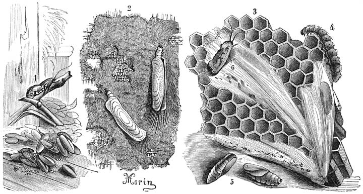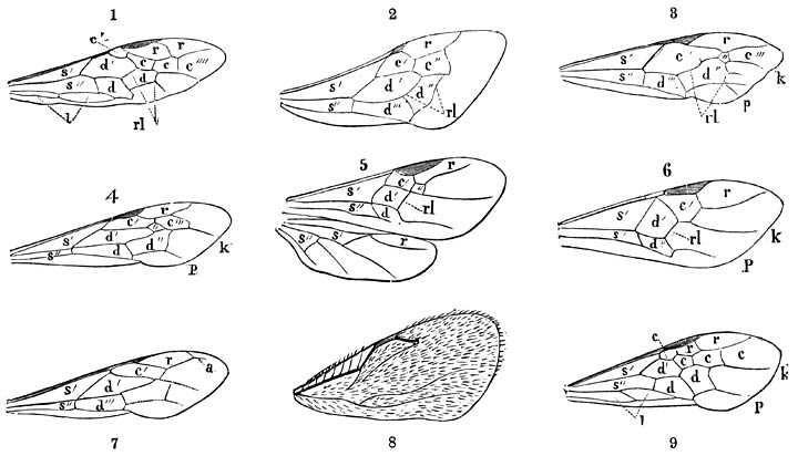 Fign. 1–5: Monddeelen van Bijen en Wespen: 1) Kop van de Honigbij van voren gezien.—2) Kop van den Aardhommel van onderen gezien.—3) Monddeelen van een Graafbij (Andrena labialis).—4) Monddeelen van de Groote Berkenbladwesp (Cimbex variabilis).
