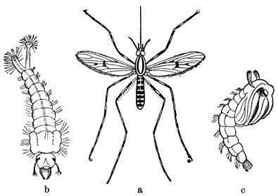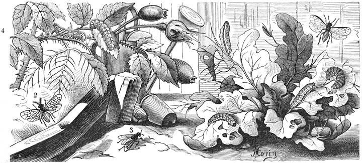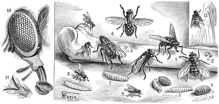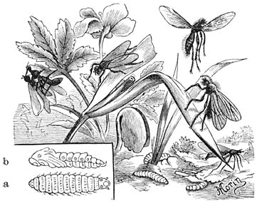 De pootlooze larven heeten maden; sommige hebben een hoornachtig harden kop; bij andere neemt het voorste deel van ’t lichaam geen bepaalde vorm aan, kan tot een spits verlengd en ver teruggetrokken worden, maar vertoont zelfs geen sporen van bijtende [361]monddeelen of van andere den kop kenmerkende organen.