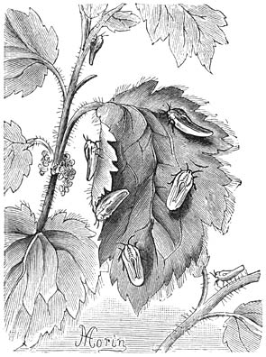 De zuigende monddeelen doen zich voor als kaken, die zulke wijzigingen hebben ondergaan, dat zij bijna onkenbaar zijn; hoe ongelijk echter hun maaksel is bij verschillende orden, kan men er toch de bestanddeelen der bijtende monddeelen in terugvinden, waarvan eenige echter niet zelden in meerdere of mindere mate onontwikkeld blijven, terwijl daarentegen de bovenlip en twee andere onparige organen in dit geval meestal een belangrijker rol spelen dan bij de bijtende monddeelen. De zuigwerktuigen van de Wantsen, Cicaden en Bladluizen herinneren door den vorm van ’t geheel aan een snavel (fig. 9). De onderlip vormt hier een uit drie of vier leden samengestelde buis, een scheede, die in haar enge holte vier fijne, nauw aaneensluitende borstels bevat. Twee van deze vertegenwoordigen de bovenkaken, de beide andere de onderkaken. Door de spitsen der borstels in het lichaam van een dier of plant te steken, verkrijgt het Snavelinsect het vocht, dat zijn voedsel uitmaakt. Een smal, driehoekig hoornplaatje, dat aan de bovenzijde van de scheede dicht bij haar oorsprong gelegen is (fig. 9: o), vertegenwoordigt de bovenlip.