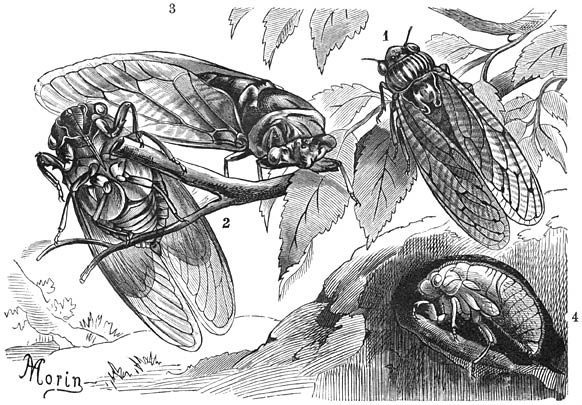 Fig. 9–11: Zuigende monddeelen: 9) Manna-cicade (Cicada orni), van voren gezien.—10) Kop van een Dagvlinder, van ter zijde gezien.—11) Snuit van een Rupsenvlieg (Tachina grossa).