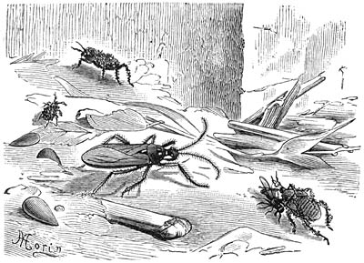 Fign. 5–9: Bijtende monddeelen: 5) Kop van de Lederachtige Aardtor (Procrustes coriaceus), van onderen gezien.—6) Rechter onderkaak van den Akker-zandkever (Cicindela campestris).—7) Rechter onderkaak van een Kortschildigen Kever (Staphylinus olens).—8) Rechter onderkaak van den Groenen Sabelsprinkhaan (Locusta viridissima).