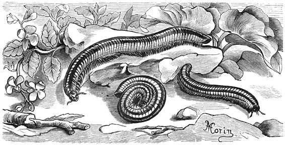 Voor den bloedsomloop dient een hart, dat den vorm heeft van een lange, gespierde buis, die onmiddellijk onder de huid van den rug in het achterlijf gelegen is en daarom ook ruggevat wordt genoemd. Door insnoeringen is het, in verband met de segmentatie van de overige organen, in een ongelijk groot aantal kamers verdeeld, die ieder door een paar spleetvormige openingen het bloed in zich opnemen. Door spiersamentrekkingen, die aan het als een blinden zak eindigende, achterste deel aanvangen en naar voren voortschrijden, wordt het bloed voortgestuwd naar de voorste kamer en door deze uitgestort in de onmiddellijk daarop volgende “aorta”, die zich tot in den kop uitstrekt en vervolgens de vloeistof vrij in de lichaamsholte laat uitvloeien. Langs dezen weg begeeft het zich in regelmatige stroomen naar alle lichaamsdeelen, keert ten slotte, vier hoofdbanen volgend, naar het hart terug en begint, na hierin door de zijdelingsche spleetopeningen te zijn doorgedrongen, een nieuwen omloop. Het bloed is meestal kleurloos, soms geelachtig of groenachtig, zelden rood.