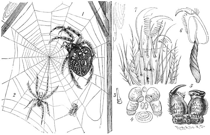 Kruisspin (Epeira diadema):—1) Wijfje. 2) Mannetje. 3) Spinpijpje. 4) Spintepels met de aarsopening (boven) en het „zeefje” (onder). 5) Kaaksprieten en oogen. 6) Linker kaakspriet, waarvan het grondlid overlangs doorgesneden is om de gifklier in haar geheel te toonen. 7) Top van het voetlid.—3–7 sterk vergr.