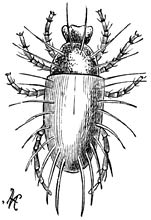 b) Lernanthropus. (Wijfje, buikzijde.) De omtreklijn herinnert aan die van een mensch, vandaar de naam. Het kopborststuk is klein en met 8 paar hechtorganen uitgerust. De beide voorste paren achterlijfspooten zijn nagenoeg verdwenen; de beide achterste paren zijn zeer groot en plaatvormig. Dit geslacht behoort tot de familie der Dichelestiden, van welker 50 soorten sommige op zoetwater-, andere op zeevisschen parasiteeren.
