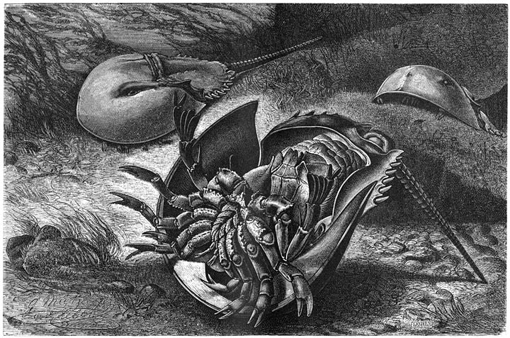 De schaal is uit verscheidene platen samengesteld en kan hermetisch gesloten worden, zoodat het dier zonder nieuwen toevoer van water geruimen tijd in ’t leven kan blijven. In ’t water houdt het de schaal geopend en brengt door voortdurende beweging der ledematen een maalstroom teweeg, die allerlei kleine zeedieren naar den mond voert.