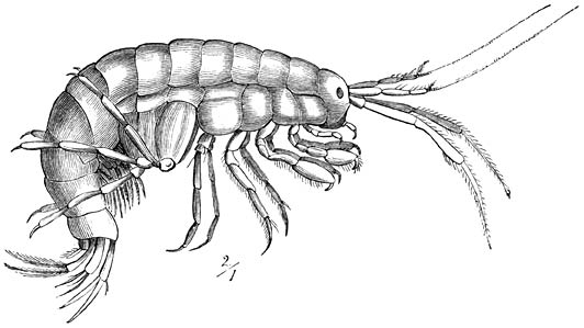 Een afzonderlijke onderorde vormen de zeer zonderling gebouwde Spookkreeftjes, die Keelpootigen (Laemadipoda) worden genoemd, omdat door vergroeiing van den kop niet slechts met den eersten maar ook met den tweeden borstring, het eerste paar ware pooten schijnbaar aan den kop is gehecht. Het achterlijf is bij hen zeer weinig of niet ontwikkeld en bezit geen of slechts rudimentaire ledematen. De talrijke, meestal niet meer dan 15 mM. lange Caprella’s, waarvan eenige ook aan onze kust gevonden zijn, leven op ondiepe plaatsen op zeeplanten. Hare werkzaamheden leveren een aardig schouwspel op. Zij zijn de beste acrobaten van hare klasse; behendig als Apen en met vele buitelingen en lichaamsverdraaiingen bewegen zij zich langs en tusschen de takken van de onderzeesche miniatuurwouden. Door haar voortdurende bedrijvigheid steken zij gunstig af bij de verwante Walvischluizen (Cyamus), welker eivormig, van boven naar onderen samengedrukt lichaam een klein, smal kopgedeelte heeft. Aan de huid van de Dolfijnen en andere Walvischachtigen, waarop zij parasieteeren, zijn zij met hare krachtige klauwen vastgehecht.