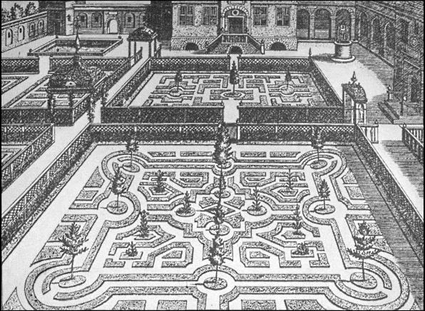 "Every Quarter of the Garden was finely hedged about with a low hedge of cypress and juniper; the Knots within set with artificial flowers. In the two first Quarters were two Pyramids, garnished with gold and silver and glittering with transparent lights resembling carbuncles, sapphires and rubies.