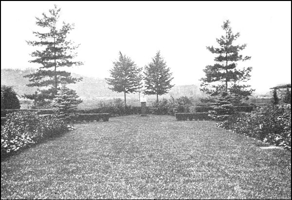 "The first step was to lay out the long, narrow strip of ground by the side of the wall parallel with Chapel Lane as a border for summer and autumn flowers—hollyhocks, canterbury-bells, lupins, larkspurs, crown imperials, lilies, and so on. As a background for these—and also to hide the ugly, cast-iron railings that disfigure the top of the wall—there was planted a row of yew trees. This border of some 300 feet long has been treated in the formal fashion of the olden time ... being divided into compartments, separated by 'buttresses' supporting 'pillars' or 'columns' surmounted by 'balls.'