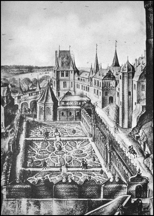 "When the Dance ended, the loud music sounded. The curtains being drawn was seen a Garden of a glorious and strange beauty, cast into four Quarters with a cross-walk and alleys compassing each Quarter. In the middle of the cross-walk stood a goodly Fountain, raised on four columns of silver. On the tops whereof strode four statues of silver which supported a bowl in circuit containing four and twenty foot and was raised from the ground nine foot in height, in the middle whereof, upon scrolls of silver and gold, was placed a globe garnished with four golden mask heads, out of which issued water into the bowl; above stood a golden Neptune, in height three foot, holding in his hand a trident.