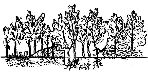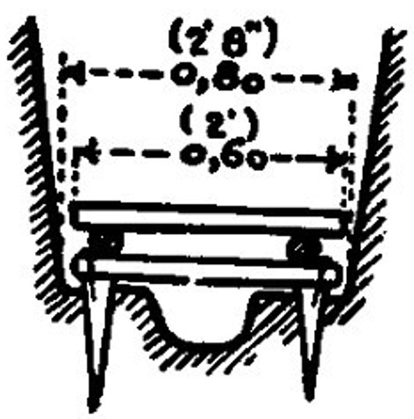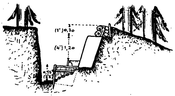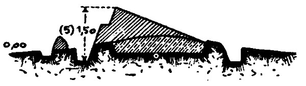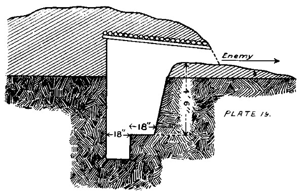 6. From 100 to 400 yards to the rear of the first line fire trench, and generally parallel to it, is the supporting trench or cover for the supports. This trench is invariably provided with strong overhead cover and a system of dugouts for the protection of the troops. (See Cover for Supports, p. 48.)