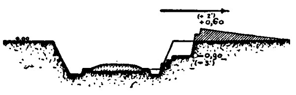 5. At a variable distance in rear of the fire trench (100 to 200 yards) the emplacements for[Pg 2] bomb-throwing apparatus and trench mortars are located. These are connected up laterally by a communication trench which joins with the main communication trench running from front to rear through the position. (See Emplacements for Trench Mortars, p. 41.)