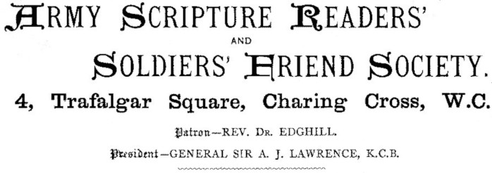 The Committee make an EARNEST APPEAL FOR FUNDS to all who have the religious and moral elevation of our Army at heart, and who would wish to see the hands of the Military Chaplains strengthened by the assistance of a body of men of the Soldiers’ own station in life, who, without the restraint unavoidable in the intercourse of different classes of Society, may commend to them the love of Christ, read to them the Word of Life, and strive to lead them from the deceitful pleasures of sin to that peace which the world can neither give nor take away.