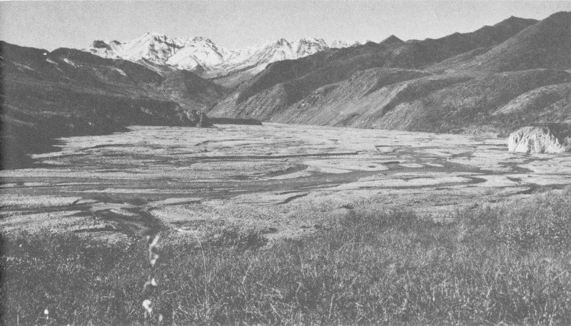A number of parallel, northward-flowing streams head in glaciers lying along the north slope of the Alaska Range. The streams are not large—most of them can be waded without getting too wet—so it is surprising to find them bordered by wide gravel bars. This is due to lack of stream stabilization. In summer the streams carry a load of silt which may be dropped along the way. Channels are continually being gouged out here and filled in somewhere else so that the stream keeps breaking over its sides and forming additional channels. High water, due to a warm day and much glacier melting, or to heavy rains, may cause the streams to flow into entirely new channels. When the main stream reaches the side of the gravel bar it will erode the bank and thus broaden the river bar. This type of erosion is noticeable just below the Teklanika bridge. Gravel bars that have not been invaded for a long period may become covered with vegetation, and it is on some of these old bars that we often see grizzlies digging roots in the spring of the year. But even these bars are temporary. One such bar on the Toklat River was invaded by part 6 of the river a few years ago and much of the sod is being washed away today. Physiographic processes are all very active in the region. On many slopes we see the turf breaking away, and here and there a small land slip.