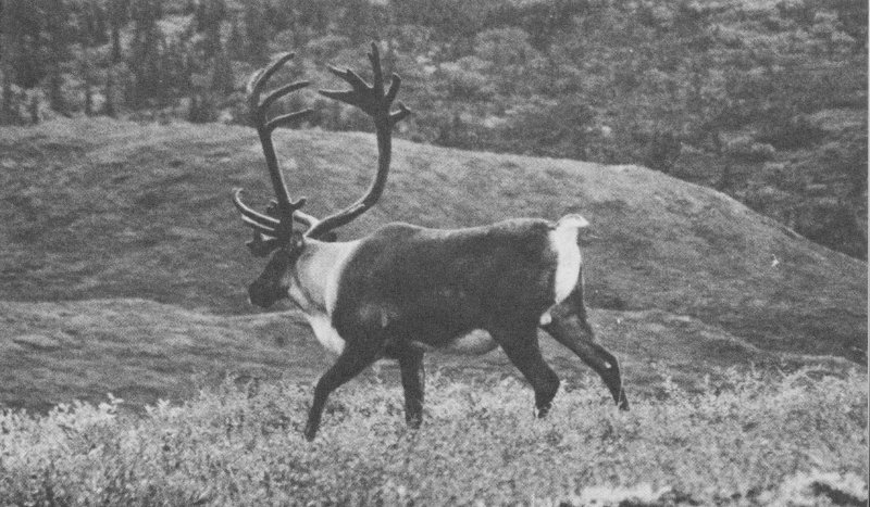 The caribou is a circumpolar deer adapted to life in the Arctic. Both sexes carry antlers and even the calves grow a spike 6 or 8 inches long. The cow’s antlers are small and branching; those of the old bull are towering and picturesque, with a well-developed brow tine extending over the nose from one or both antlers. As you see the caribou in his 12 easy, swinging trot, you will perhaps notice his big feet. The hoofs, rounded and spreading, and the dew claws well developed, serve him as snowshoes in winter, and as a broad support in the soft tundra.