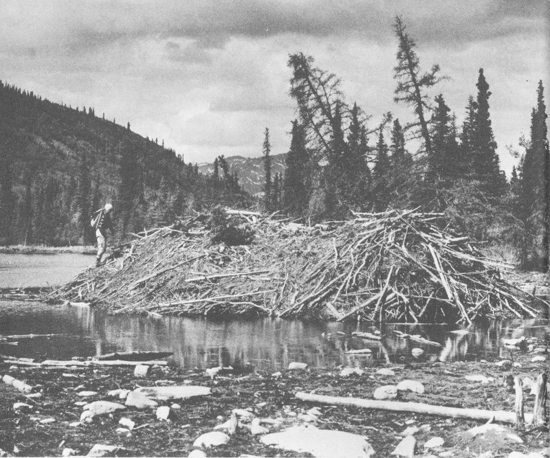 In some parts of Alaska where extensive favorable pond habitat prevails, muskrats are abundant and their sedge lodges are a part of the scenery. In the park there are a few muskrats in Horseshoe Lake and other ponds and creeks near the eastern border, and also in the Wonder Lake area. These usually live in bank burrows with submerged entrances. It is not uncommon to find a muskrat living in an occupied beaver house, apparently utilizing an unoccupied cranny. They ply back and forth across the pond, just as the beavers do, and submerge with a mouthful of sedge which they are taking to the young. At Wonder Lake, I have seen muskrats swimming under the little bridge across the stream inlet, carrying sedges to young that were kept in a burrow in a nearby bank of the lake.