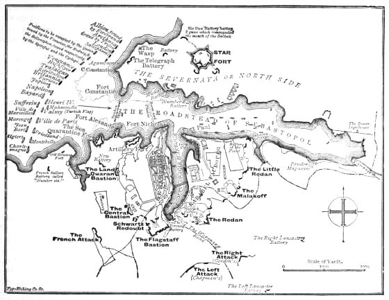 Two Days on the Alma—Retreat of the Russians—Raglan proposes a Flank Movement—Korniloff and Todleben—Death of St. Arnaud—The Allies in Position—Menschikoff reinforces Sebastopol—Todleben's Preparations—The Opposing Batteries—The Sea—Defences of Sebastopol—Doubts of the Admirals—Opening of the Bombardment—The French Fire silenced—Success of the British—Failure of the Fleets—The Bombardment renewed—Menschikoff determines to Raise the Siege—The Attack on Balaclava—Lord Lucan's Warning—Liprandi's Advance—Capture of the Redoubts—The 93rd—Lord Lucan's Advance—Charge of the Heavy Brigade—Raglan, Lucan, and Nolan—Charge of the Light Brigade—The Valley of Death—The Goal—End of the Battle 50