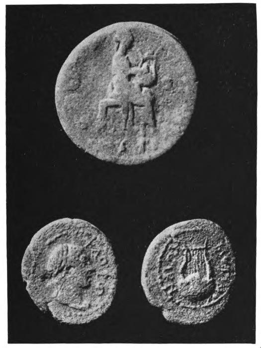 Showing probably Sappho’s head on one side and lyre on other. Enlarged twice the original size. Reproduced from Miss Patrick, Sappho and the Island of Lesbos, p. 73